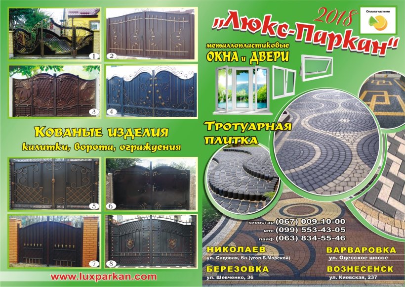 Комапния ЛЮКС-ПАРКАН с 2004года занимается производством еврозаборов (бетонных заборов, бетонных плит, бетонных ограждений, наборных бетонных заборов) в Николаеве, Одессе, Вознесенске, Березовке, производством тротуарной плитки в Николаеве и Вознесенске методом вибропресования. Также "Люкс-Паркан" занимается изготовлением металлических ворот в Николаеве, металлических ворот в Одессе , металлических ворот в Вознесенске, металлических ворот в Березовке. Мы изготавливаем ворота из металла в Николаеве (кованные ворота из металла, сварные ворота из металла) в Одессе , Вознесенске, Березовке, калитки металические (калитки из металла) в Николаеве, Вознесенске, Березовке, Одессе , козырьки в Николаеве, Вознесенске, Березовке, перилла в Николаеве, Вознесенске, Березовке, балюстрады, лестницы и многое другое в г. Николаеве и Николаевской обл.